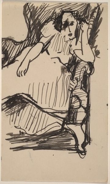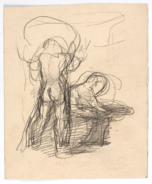 Curator: This is Ernst Ludwig Kirchner's "Kniender Akt," created around 1905. It's a charcoal drawing. What are your first thoughts? Editor: Angular. Stark. There's a restless energy in those lines. It's definitely not trying to be pretty. Curator: No, beauty in the traditional sense isn't the point. The figure is contorted, almost struggling, yet there's a vulnerability in the bowed head. For Kirchner, and the Expressionists, the external world reflected the inner turmoil of the individual and society. You see it in the visual language, right? Editor: Absolutely. And the rawness of the charcoal on paper contributes to that feeling. You can almost feel the artist’s hand, the pressure, the speed. It looks rapidly made; did he intend it as a preparatory study? Was charcoal his material of choice at the time? The visible process lends to its impact, I'd wager. Curator: Precisely. The medium wasn't just a practical consideration, it became part of the emotional statement. German Expressionism valued authenticity of feeling above all. But I'm also curious about the figure's downcast gaze. Is she ashamed? Contemplative? There's something undeniably melancholic there. Editor: Perhaps both. The lack of polish actually enhances the intimacy. The labor feels immediate, too, less refined than typical nudes of its time. It suggests something quickly consumed by Kirchner or perhaps just something unfinished. Was this paper a readily available type, you know, to receive such quick lines? It begs many questions, for sure. Curator: I agree. The suggestive, unfinished state encourages speculation. The kneeling figure could symbolize penance, surrender, or even quiet defiance in the face of oppressive social norms of the time. Editor: I like how it manages to hint at narrative without telling a concrete story. A material study turned potent emotional image... food for thought. Curator: Indeed. Kirchner offers us a glimpse into the complex and often conflicted psyche of the early 20th century. A fleeting emotional charge made durable with accessible materials.