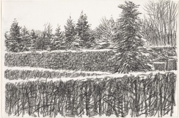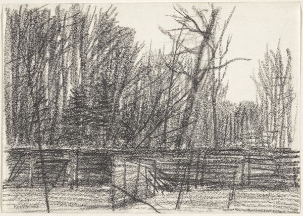 Editor: This is "Bosrand," a pencil drawing by Kees Stoop, created sometime between 1939 and 2009. The trees look like they are huddled together, and the texture almost feels like a memory itself. What do you see in this piece, looking at it with an eye for symbolism? Curator: It strikes me as a portrait of refuge. Trees have been symbols of protection, growth, and interconnectedness across cultures. Stoop renders them almost defensively, densely packed. Do you feel a sense of enclosure, a defined edge to this “bosrand”? Editor: Yes, it's like a screen or a barrier, the boundary between something wild and… nothingness? The blank paper beyond the trees seems infinite and a bit unsettling. Curator: Precisely! Consider how artists have historically depicted liminal spaces. Forests, as boundaries, represent transitions—leaving the known and entering the unknown, confronting primal fears, and seeking spiritual insight. What sort of "transition" or liminal space do you see suggested here? Editor: Well, the dates – 1939-2009 - make me think of the Second World War and the artist’s lifespan, so maybe it represents a personal search for refuge during turbulent times, perhaps even an inward journey for peace of mind, during and after the war. Curator: Indeed! And look how Stoop emphasizes the *form* of the trees. This isn't just about accurately depicting nature; it's about exploring the very essence of "forest-ness," a kind of Platonic ideal reflected in each individual tree. Form holds content! What emotional weight does that repeated, almost obsessive, rendering of form lend to the piece? Editor: It adds to that feeling of seeking solace; the repetition feels like a mantra, like the artist is trying to ground himself in the basic forms of nature. Curator: A wonderful observation. Stoop gives us not just a drawing, but a symbol of resilience, memory, and the enduring power of nature's forms to comfort and protect us. Editor: This has definitely given me a deeper appreciation for what's communicated through what seems like a very simple drawing. Thanks for sharing your perspective!