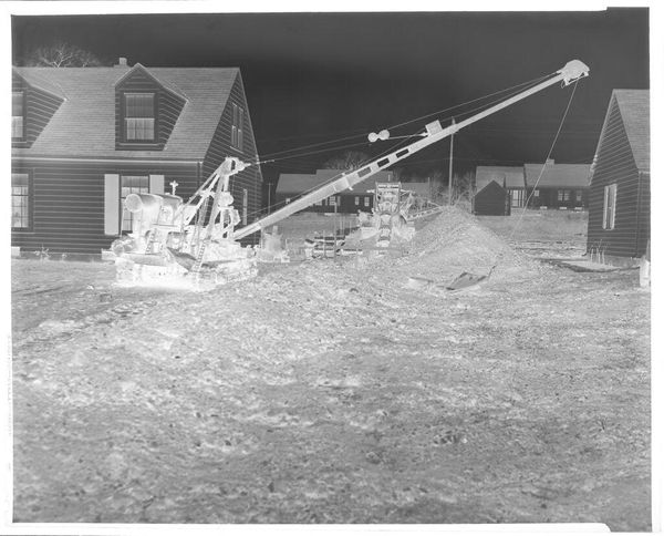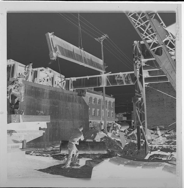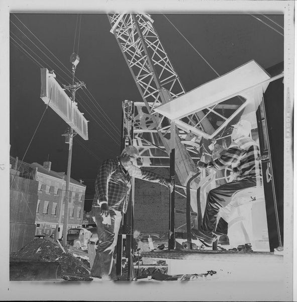 Editor: This small, untitled photograph by Jack Gould depicts the construction of a building, focusing on two men and a crane. The sharp contrasts and the focus on the raw materials give it a very industrial feel. What catches your eye in this piece? Curator: I'm drawn to the process, the labor involved. Look at how Gould frames the steel beams, the crane, the workers. It's about the making of something, the sheer physical effort, and the consumption of resources inherent in such a project. The photograph documents the labor as material. Editor: So, the photograph itself becomes a record of that material process? Curator: Exactly. And it invites us to consider the social context – who are these workers? What are their lives like? The photograph is not just an image; it's evidence of a specific kind of work and its place in the urban landscape. Editor: That's a perspective I hadn't considered. I was so focused on the aesthetic qualities. Curator: It’s about recognizing the value in the often-overlooked aspects of art and labor.
