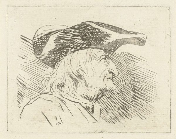 Curator: Well, well, this fellow has quite the story etched on his face, doesn’t he? I see a life fully lived. Editor: Absolutely! Though somewhat comical, it carries such an individual spirit. Is this “Portret van Abraham van Wielen met hoed en bril” created sometime between 1774 and 1808, I presume? What can you tell us about the historical setting and possible patrons? Curator: Indeed. This intriguing piece, attributed to Johan Antoni Kauclitz Colizzi, seems crafted from the intricate strokes of etching, drypoint and ink techniques. As a portrait, it offers an almost unvarnished glimpse into the sitter's persona. Note his spectacles; eyewear became more prevalent during the 18th century as literacy rates rose among the merchant classes. Editor: It is a peculiar detail, to be sure. And I agree, that glimpse seems almost unflattering, almost brutally honest for a portrait. The tight lines certainly highlight the contours of his nose, even emphasizing his, ahem, distinctive features. What might it tell us of 18th century portraiture, or the subject’s personal standing that such realism was considered appropriate, or even desired? Curator: Exactly! It certainly speaks volumes of the burgeoning societal value on transparency, perhaps a move away from glorifying idealizations toward embracing individual imperfections. Could Van Wielen’s choice to embrace such an unidealized depiction represent self-awareness or perhaps social commentary about his position in Dutch society? Editor: Yes, the lines, despite the somewhat comic quality, are determined and quite unforgiving! I am stuck on these spectacles though; what are they telling us here? What kind of archetype could that symbol suggest at that time? Curator: The glasses suggest intellect, sure, and perhaps scholarly or professional distinction. We are reminded about knowledge and enlightenment ideals taking hold in society. But maybe they signal more simply, something quite literal like diligence to business! Editor: Perhaps both the tangible and symbolic intertwining? Interesting food for thought. Well, thanks to that contemplation, the drawing offers an immediate appeal on further study. Curator: Absolutely, delving into such art lets us uncover layers that connect with both past and present sensibilities. I love his hat.