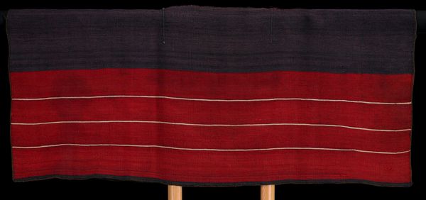 Curator: This is an Aymara woman’s ceremonial skirt, an *asku*, dating back to approximately 1850. It’s currently held in the collection of the Minneapolis Institute of Art. Editor: My immediate impression is of groundedness and quiet dignity. The deep brown field is incredibly rich and calming, while the banded sections introduce a welcome bit of levity and rhythmic interest. Curator: These skirts, especially the details within the bands, carry a potent cultural weight. The colors, motifs, and even the weave itself were laden with symbolic meaning. Certain patterns might signify status, lineage, or specific ritual roles within the community. The horizontal bands, in their repetition, reflect cyclical concepts of time and existence so central to Aymara cosmovision. Editor: Absolutely. The horizontal banding also creates a very clear structure. The warm shades of red, orange and muted gold used for the thin lines really sing against the darker weave of the underlying cloth, particularly as they're broken by the narrow band of contrasting texture with the pale green in the middle. This lends the whole piece a quiet vibrancy. Curator: That vibrancy certainly would have played a role in ceremonial settings, signaling not just belonging but also embodying the collective memory of the Aymara people. Textiles such as this become more than mere clothing; they become active participants in maintaining cultural continuity. The hand-crafted nature adds another layer, doesn't it? Each imperfection underscores the individual artisan and their link to the community. Editor: Exactly! And consider the textile itself – its weave, the quality of the threads. It’s a beautiful, tightly structured piece where individual fibers work in harmony, creating both visual impact and physical form. The texture invites closer inspection. It makes you think about the time and care poured into its construction. Curator: When we consider the ritual context, those hours become a form of devotion, weaving prayer and intent directly into the skirt. An object like this connects to a profound sense of identity. Editor: Yes, looking closely reveals the artist's formal choices—a study in simple geometric abstraction. The textile embodies an incredibly rich narrative tradition using only bands of color and texture. Curator: Seeing it now through both lenses enriches my understanding. Thanks for revealing a different layer. Editor: The pleasure was all mine. To decode these symbolic and structural aspects together helps bridge our understanding across both time and cultures.