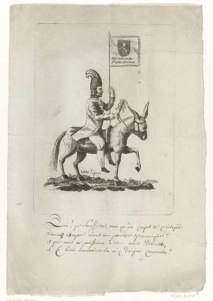 This is the title page for Johannes le Francq van Berkhey’s, "De Politieke Hollandsche Koemarkt," or, "The Political Dutch Cow Market," created by an anonymous artist in 1787. This etching, now held at the Rijksmuseum, offers a glimpse into the turbulent political landscape of the Dutch Republic during the late 18th century. In the print, we see two figures engaged in what appears to be a transaction involving a cow. This seemingly simple scene is loaded with political symbolism, reflecting the tensions between different factions vying for power in the Netherlands. The cow, a symbol of Dutch prosperity and agricultural wealth, becomes a pawn in the power struggles between the elite and the common people. What is striking is how this image encapsulates the complexities of identity and power during a period of immense social and political upheaval. It invites us to reflect on how economic interests and political maneuvering shape our understanding of nationhood, and who gets to participate in defining it. It serves as a reminder that art can serve as a mirror, reflecting the hopes, fears, and struggles of a society grappling with its own identity.