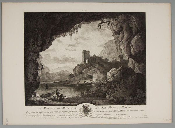 Antoine de Marcenay de Ghuy created this river landscape by moonlight, seen from a cave, using etching. It represents a scene of rural leisure, but let’s consider how the image creates meaning through its visual codes and historical associations. Made in France, Marcenay de Ghuy’s work reflects the 18th-century French elite's fascination with the pastoral. This wasn't just about pretty scenery, but also a commentary on social structures. The ruined castle in the background, for instance, could symbolize the decline of feudal power, while the fishermen in the foreground hint at a rising merchant class. The cave offers a perspective, inviting viewers to consider their place within this changing society. Art historians can use estate records and other texts to shed light on these social shifts, allowing us to appreciate how artworks comment on the social structures of their own time.