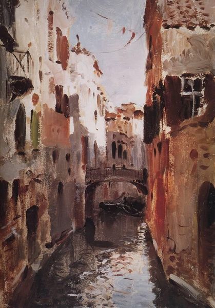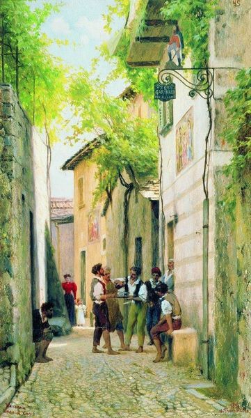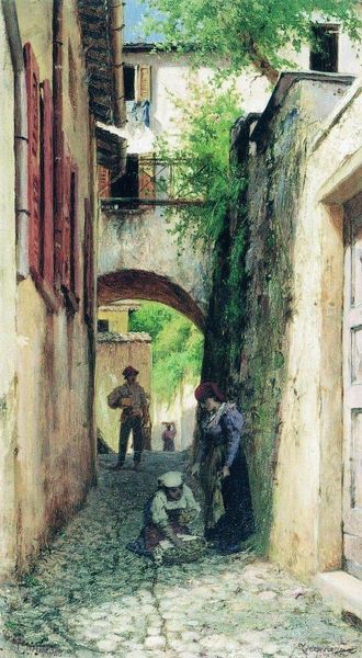 Curator: Welcome. We're looking at Fyodor Bronnikov's painting, "Bellagio," created in 1875 using oil paints. Editor: The first thing that strikes me is the light, filtering down this narrow street. It’s almost a spotlight on the figures gathered at the end, so familial, very Italian I would venture. Curator: Bronnikov situates us within a specifically European historical context here. We can discuss how this particular cityscape lends itself to an understanding of 19th-century notions of Italian culture, particularly as a site of both historical depth and contemporary social life. The buildings have stories etched in every stone, yet life continues within and around them. Editor: You're so right, and you said "etched"—it literally looks like time has been painting away on the stones. Tell me more about why this artist was drawn to genre painting. The scale is interesting too, so intimate for something grand, no? Curator: Bronnikov, associated with realism, engages in a form of visual storytelling, inviting us to consider how the genre of the cityscape can serve as a canvas for broader narratives around community, class, and daily life, right? Notice how these figures add to an ongoing theater of living… This, for me, provides a lens to see class dynamics as an extension of power relations across Europe at that time, but I am curious to know your thoughts on the Renaissance influences in this work, that are quite obvious as well. Editor: Good call—that framing feels almost like an old master looking out at us. I think for me, there's a tenderness in the work. In regards to an influence, this "window" to me reminds me of the compositions in frescoes as well! The colors are so vivid, almost hopeful against the stones—I imagine they chose Bellagio deliberately. Curator: Hope, yes. It’s this potential for the contemporary—present in that wash of light at the street's end—that feels deeply resonant still. I suppose that’s why, a century later, “Bellagio” manages to still stir. Editor: Right you are, there. I hope a viewer allows themself the opportunity to reflect on those subtle dynamics of power when encountering a piece of artwork like this one.