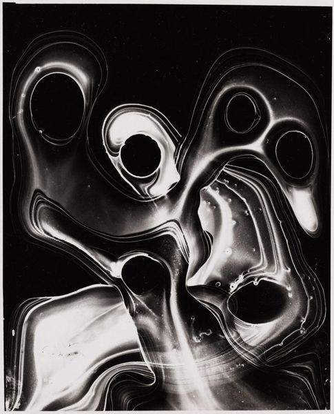 Curator: Take a look at this small photograph by Siegfried Lauterwasser, titled "Untitled (Mirroring in Water)." Editor: My first thought? It feels almost ghostly, like a blurred memory surfacing. The high contrast gives it an abstract, dreamlike quality. Curator: Exactly! Lauterwasser captures the ephemeral nature of reflections, using light and shadow to distort reality. It's not just about seeing; it's about feeling the instability. Editor: The composition, though, is quite deliberate. Notice how the swirling shapes create a vertical flow, drawing the eye upwards. The materiality evokes the feeling of fluidity. Curator: For me, the beauty lies in its simplicity. It’s a reminder that sometimes, the most profound art comes from observing the everyday, finding the extraordinary in the ordinary. Editor: Indeed. It invites us to reconsider how we perceive the world, doesn't it? Curator: It does. And to question what's real and what's simply a reflection. Editor: A beautiful and thought-provoking image, indeed.