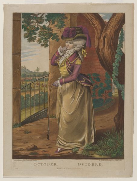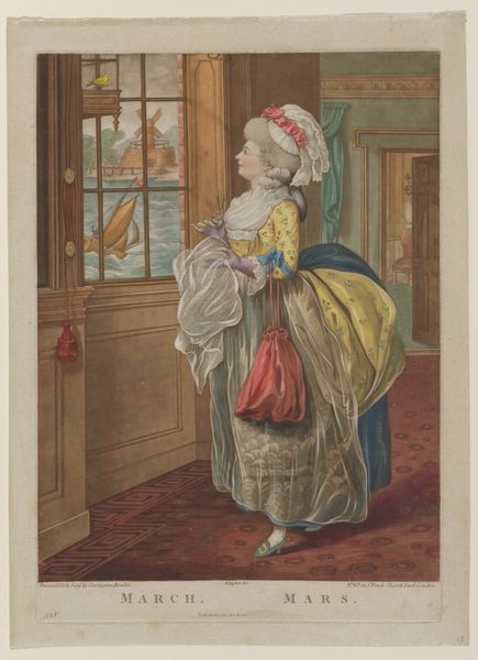 Robert Dighton created this hand-colored etching titled "February" sometime between the late 18th and early 19th centuries. It depicts a young woman indoors, strumming a long-necked lute-like instrument. During Dighton’s time, class distinctions dictated social roles and access to leisure activities, and the woman's attire and surroundings indicate her privileged status. Yet, this is not just a portrait of wealth; it evokes a sense of the seasonal experience. The imagery is complex: a blazing fire promises warmth, yet the window reveals a snowy landscape, representing February's duality. The woman seems happily lost in music, perhaps finding solace from the winter chill. Rather than upholding traditional, formal portraiture, Dighton captures a moment of personal reflection and the simple pleasures of music during the quiet of winter. The scene reflects the intricate dance between social position, personal comfort, and the emotional impact of seasonal change.