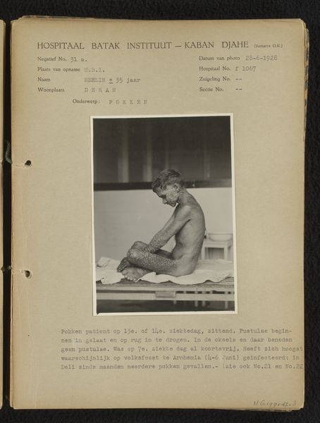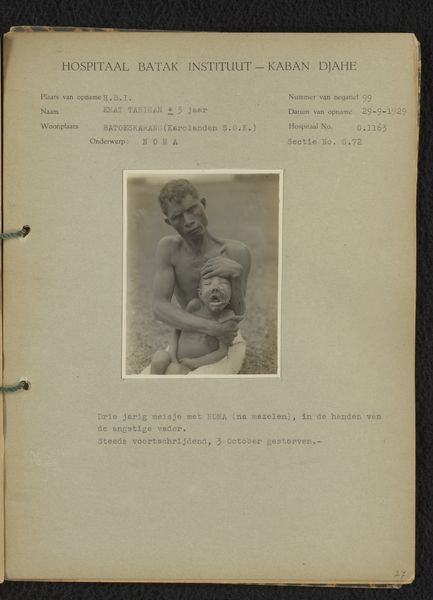 Editor: Here we have a photograph from 1928 titled "Kind met voedingsstoornissen," which translates to "Child with Nutritional Disorders," taken at the Hospitaal Batak Instituut. It's a sobering image. What stands out to you? Curator: This image operates as both a medical document and a stark social commentary. The very act of documenting this child’s condition within the colonial medical gaze raises questions about power, representation, and exploitation. We need to ask: Who is this image for, and what purpose does it serve? Editor: I see what you mean. It feels like it’s less about the individual child and more about a larger problem… like, a public health concern? Curator: Precisely. Consider the colonial context. Medical photography was often used to justify and perpetuate racial and social hierarchies. By visually documenting "nutritional disorders," were colonial institutions perhaps reinforcing ideas of racial inferiority or inherent deficiency? Editor: So the focus isn't just on the child's health, but also on how this image participates in a system? It makes me uncomfortable thinking about it like that. Curator: The discomfort is important. This photograph, while seemingly objective, is embedded within a web of political and social meanings. The “scientific” gaze becomes another form of power, solidifying colonial dominance. Where does compassion fit into all of this? And how can we, as viewers today, ethically engage with such a loaded image? Editor: I didn’t realize a single photograph could contain so much complexity. Now I'm left wondering about the ethics of seeing and sharing images like this. Curator: Exactly, it's about acknowledging the past and its lasting impact while striving for more ethical and equitable visual practices in the present.