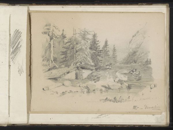 Curator: Right now, we’re looking at a pencil sketch titled "Spruce Trees at the Via Mala," housed here at the Städel Museum, by Johann Wilhelm Schirmer. Editor: It feels so...still. The soft graphite gives everything a hushed, almost ethereal quality. The trees seem to just barely be there. Curator: I think that speaks to the tradition Schirmer's working within, wouldn't you say? Landscape in the Romantic tradition seeks to capture not just the scenery, but the sublime emotion that the viewer, or indeed the artist, experiences in nature. The almost feverish speed of the pencil sketches really communicates the ephemeral, ungraspable qualities of those emotions. Editor: Speed is right! Look at the varied pressure and the visible layering of marks—that frantic energy to capture something is so apparent. He’s noting details, sure, but more than that he's figuring something out about the forms right on the page. What paper is he using, I wonder? It has some tooth to really grab the graphite, judging by how dark he's gotten it in places. And what pencils did he use? Are some harder than others to create this full range of tonal values? Curator: Great questions! He seems to use graphite, chalk, and possibly even etching on paper. Looking at the sharp contrast between the rocks in the foreground, this would indicate different media utilized for light and depth within the study. I feel that the visible geological strata and construction—note that collapsed, human-made pathway held up by a single timber!—hint to us that Schirmer perhaps sought out locations for more than mere picturesque aesthetic appreciation. It shows how mankind’s labor attempts to traverse these mighty formations. Editor: Absolutely, and the Via Mala was a significant trade route, wasn't it? I am always thinking about how these landscape images were also, you know, records of infrastructure. Like, we see sublime nature, but somebody also built that little fence up there, laid that path, tried to control this space. I like how this sketchbook page holds all of those things together. Curator: It is as if the material and the immaterial converge, yes. And what results is a deeply atmospheric emotional expression…almost like the pencil is exhaling the spirit of the place. Editor: Almost like we can feel the artist grappling with the pressures both human and geological, leaving a visible trace. Thanks to both we're able to consider their impacts and create our own lasting trace, too.