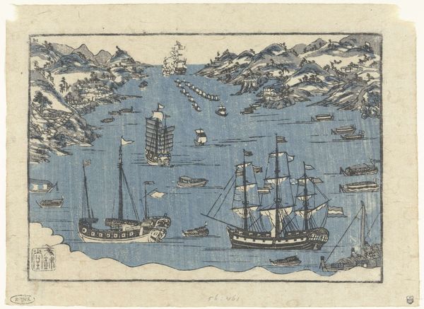 Editor: So, this woodblock print, "No.Arai," created by Utagawa Hiroshige sometime between 1847 and 1852, has a delightfully serene feeling, almost dreamlike. The blues are so gentle, and those sails, almost weightless. What do you see in it, beyond the boats? Curator: I see a dance, darling! A dance between stillness and movement. The boats, yes, they're there, anchored in a very specific moment, but Hiroshige, bless his artistic soul, captures something far greater – the rhythm of the journey. I sense the breeze, feel the gentle rocking, maybe even a faint taste of salt. Ever been completely present somewhere, knowing, REALLY knowing, it's a fleeting instance? It's that feeling distilled onto paper. Isn’t it interesting how a static image can evoke such dynamism? What strikes you about the composition? Editor: How the eye is drawn across the water... I like how there's activity on the boat, but calmness surrounding it, as you were saying. Did these prints have a particular purpose, besides just being art? Curator: Ah, now there's a delicious question! These ukiyo-e prints were popular souvenirs, bits of captured experience along the famous Tokaido Road. Imagine a traveler wanting to carry a moment like this one with them – not just the physical landscape, but the memory of the feeling itself! They aren't merely pretty landscapes; they’re time capsules of sensation. Do you find yourself longing to be transported there? Editor: Definitely! It makes me think about the little moments in my day, ones I wish I could freeze and hold onto. I guess it really highlights how art captures life, doesn't it? Curator: Precisely! It reminds me that art, like life, is not about the grand events, but the fleeting whispers in between. Thanks for the insightful conversation, friend.