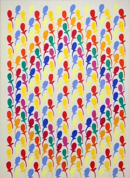 Keith Haring painted this ‘Tree of Monkeys’ sometime in his short but productive life using bold, flat, graphic colors to make a striking image. The thing about Haring’s work is, it’s all about the line. Look how he uses black outlines to define each figure, giving them a cartoonish, almost graffiti-like quality. The monkeys, rendered in playful pink, are frozen mid-action, clinging to branches, cavorting in pairs. Each branch is marked with small leaf shapes, like a rhythmic series of brushstrokes. The marks create both a sense of depth and a decorative pattern. The background is a sea-green that makes the pink monkeys and the yellow tree pop. It’s not about realism, it’s about energy, rhythm, and joy. Haring’s work is often compared to Jean-Michel Basquiat for its street art origins and social commentary. Haring once said that art is for everyone. This painting is a great example of that sentiment, art that embraces simplicity, yet speaks volumes.
