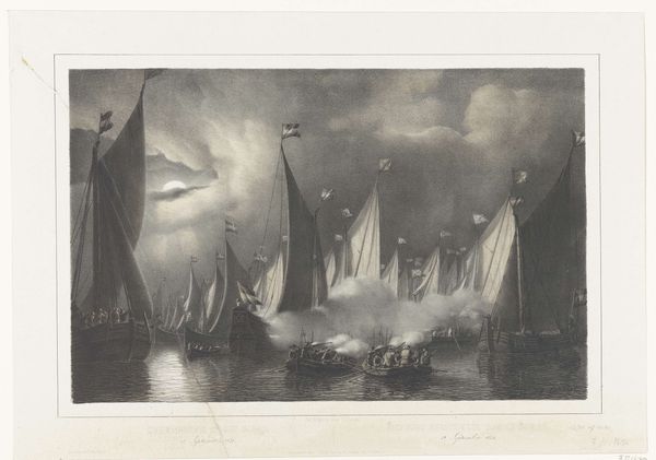 Editor: This is Eugène Isabey's "Memory of St. Valery on Somme," a print made using an etching technique. I'm struck by the rough texture and the dramatic sky. What can you tell me about it? Curator: The print reveals much about the economic realities of artistic production. Consider the accessibility of printmaking versus painting. How does the choice of etching, a process involving acid and metal, reflect the social context of artmaking during Isabey's time? Editor: That's a great point. It’s more about the process and the means than just the image itself. Curator: Exactly. And look at the imagery – a beached boat, implying labor and the maritime industry. How does this contrast with traditional, idealized landscape paintings? We see the working world directly. Editor: I see. It shifts the focus to the everyday lives of people, not just pretty scenes. Thank you. Curator: My pleasure. It’s about questioning whose stories get told, and how.