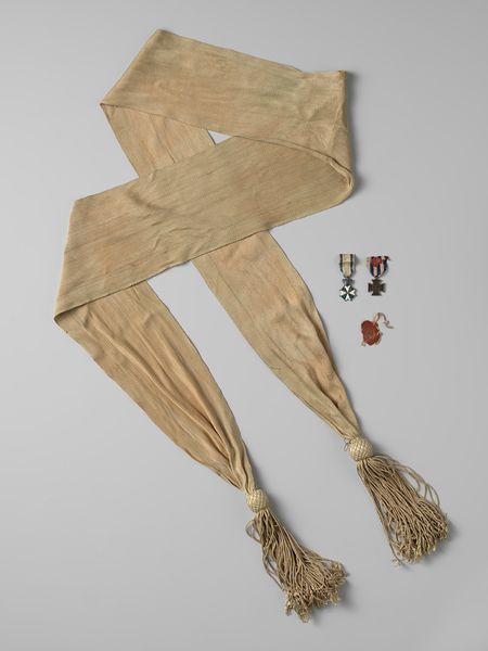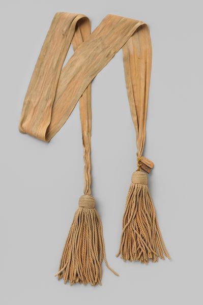 Curator: Immediately I see a sash of some kind. It appears quite delicate and aged. Editor: Yes, what we’re looking at is a sash worn by Captain Blankenheim. It's believed to be from around 1800 to 1830, a time of upheaval. An anonymous work made from textile and fibre art elements. There's a subtle sense of romanticism. Curator: It certainly evokes that era! To me, the golden hue is reminiscent of sunlight reflecting on a battlefield— perhaps a symbol of courage, resilience, and, above all, honour. Editor: Perhaps… though honour meant different things in different ranks, I'd wager. The gold shades could symbolize the rewards promised to those fighting colonial wars. As a captain, he held a powerful position and greatly benefitted from colonial trade practices that dispossessed others of their wealth and land. Curator: But, is there more to unpack beyond socioeconomic and historic contexts? Consider it not as belonging to a person but belonging to an ideal: military prowess, a mark of valor; after all, those tassels carry weight in the realm of military adornment. Editor: It depends on what we consider "value". Military honour, sure, but at whose expense? Consider its construction: What lives were touched for this delicate piece of textile to exist? This artefact may seem simple, but it opens up a web of labor, power, and societal narratives, most of which go unacknowledged. Curator: You bring forth valid points. Every artefact echoes untold narratives. While not everything is cast in gold, symbolism adds many layers that deepen its essence beyond mere craftsmanship, it is the tangible ghost of an ideal. Editor: True, an “ideal" sustained by human, very real, sacrifices. As we observe historical artifacts, it’s essential to reflect on their multi-layered impact, ensuring those in the periphery receive their recognition. Curator: A wonderful discourse. The sash carries the echoes of historical glory alongside silenced voices—an emblem forever interlinked. Editor: Indeed, and that's how a simple sash becomes a conduit for challenging established historical views, inviting introspection regarding our relationship with the past.