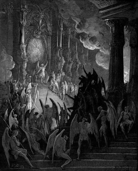 Curator: Looking at this dark monochromatic drawing by Gustave Doré, titled "Barthelemi undergoing the Ordeal of Fire," I immediately feel the intensity of the scene. It's so dramatic! Editor: It is a striking composition, isn't it? The subject matter itself offers fertile ground for exploring power dynamics during periods of religious fervor and how the role of institutions play in such events. Dore seems concerned here with illuminating an episode in this complicated entanglement of belief and authority. Curator: Absolutely. The “ordeal by fire,” it makes you think about what that really represented. Beyond faith in divine intervention, this ritualized trial laid bare society’s prejudices onto individuals and reveals a profound intersection of power and superstition. What readings could be done of Barthelemi? Editor: Given Doré’s consistent commentary on social justice issues, it's not outlandish to imagine him questioning the validity of power exercised under the banner of piety, a common thread throughout 19th-century art critiquing established authority. His choice of engraving further enables broader dissemination among popular audiences familiar with similar scenes found in illustrated versions of the Bible or classic literary texts—essentially broadening its social impact through medium itself. Curator: And you can see this incredible range in values and textures achieved only through the laborious craft of engraving and photography which contributes to its impact, rendering this very graphic visual drama. The flickering light against those black costumes becomes quite unsettling! There’s something potent about that juxtaposition here: spectacle of presumed sanctity alongside its possible absurdities? Editor: Exactly. This imagery taps into something profoundly unsettling that persisted despite Enlightenment attempts at reasoned thought or social reformation. What should we make, therefore, concerning representations similar as vehicles either to endorse or indict prevalent norms across changing sociopolitical terrains within a global art context? What is so remarkable concerning their influence on visual culture regardless? Curator: Considering Doré's critical perspective as you've framed it, this piece pushes viewers to ask fundamental questions. Who constructs the norms? Who is sacrificed by them? Who holds responsibility concerning actions justified on premises regarding absolute truths whose effects determine realities concerning individuals? Editor: Precisely. These probing dialogues with artworks serve ultimately in questioning conventional attitudes even today since they encourage the necessary critical engagement with visual materials that constantly shape both how and who sees what within societies and themselves ultimately!
