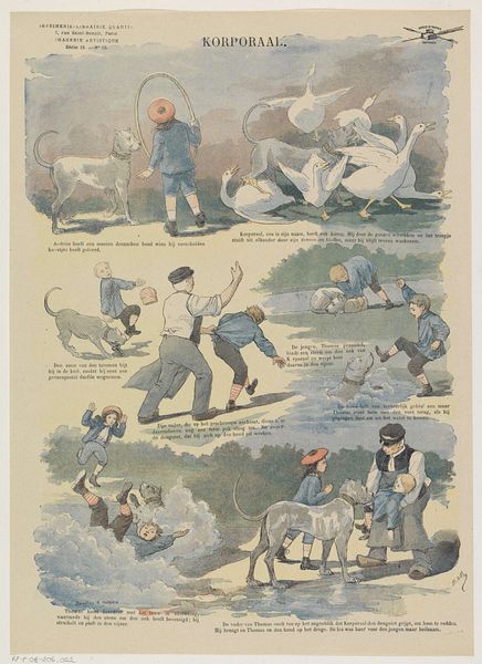 Editor: This print is entitled "De lotgevallen van Azor" by J. Vitou & Co., dating from between 1876 and 1892. It seems to depict a series of scenes in the life of a dog. I'm struck by its folksy, narrative quality and the dog’s vulnerability in so many of the panels. How do you interpret this work? Curator: It's fascinating to see this visual narrative, particularly within the context of the late 19th century. "De lotgevallen van Azor," or "The Fortunes of Azor," seems to mirror the era's anxieties around class and social mobility, using the dog as a proxy. Notice how Azor's circumstances shift dramatically across these panels – from a domestic setting to the streets, encounters with other animals, and interactions with various humans. To what extent, do you think, does the dog’s representation highlight shifting attitudes about animals and their place in society during this period? Editor: That's an interesting point! I hadn’t considered the social commentary aspect. Perhaps Azor's journey also speaks to urbanization and displacement as traditional ways of life changed. Curator: Precisely! The artwork might reflect growing industrialization, connecting this particular canine narrative with concerns about economic and social justice. This prompts us to ask questions regarding the intersections of art and politics. Do you see parallels between Azor's journey and broader themes of social alienation and the struggle for survival within the capitalist system? Editor: That's made me see this work in a completely different light. I was drawn in by the story at first, but it sounds like there are layers of deeper meaning about societal issues. Curator: Absolutely. Considering these artworks within socio-historical and political narratives illuminates aspects that may go unnoticed with a simple appreciation of form. Hopefully, you will find many more intersectional areas within art history.