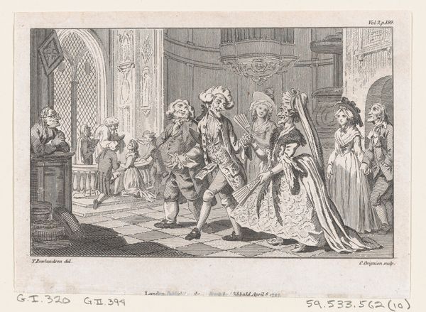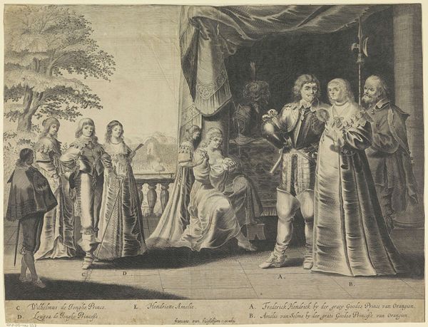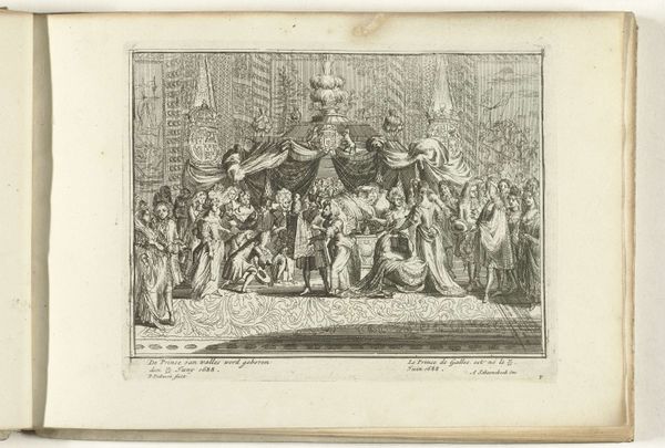 Editor: So, this print, "Louis XIV Bestowing the Cordon Bleu on the Infant Duc de Bourgogne," dates back to 1729. It's a flurry of lines, created with etching and engraving. I find it… curiously staged. It feels less like a snapshot of history and more like a meticulously constructed performance. What do you make of it? Curator: Oh, the "performance" is precisely the point! Think of it as royal PR, centuries before Instagram. This isn’t just a depiction; it’s a declaration. The baroque style, with its grandeur and ornamentation, amplifies the King's power. Consider how the light illuminates Louis XIV, the very image of authority. It's a strategic visual argument, isn't it? He is legitimizing his line through spectacle and symbolism. Almost…theatrical? Editor: Definitely theatrical. So, beyond the obvious promotion of royal power, are there other nuances we should be picking up on? I am thinking specifically about why produce this scene as an engraving/etching? Curator: Yes, consider that engravings, as printed material, spread narratives much faster than singular painted versions; so, yes, royal propaganda printed en masse. The etching allows for that gorgeous detail in the costumes. Ask yourself, what do those specific garments suggest about status, wealth, taste, privilege, right? Think of it less as an isolated artwork and more like a meme– it had to go viral. Did it succeed, do you think? Editor: Well, here we are, talking about it centuries later. So I guess it kind of did. I hadn't considered the distribution aspect so explicitly. It makes total sense. Curator: Exactly! It’s a multi-layered creation – history, art, propaganda all intertwined. Keep peeling those layers and asking 'why' to what you see, and you'll discover an art history far beyond aesthetics alone. It's a story being told through the etching, and in every royal pose.