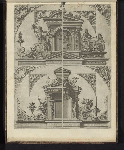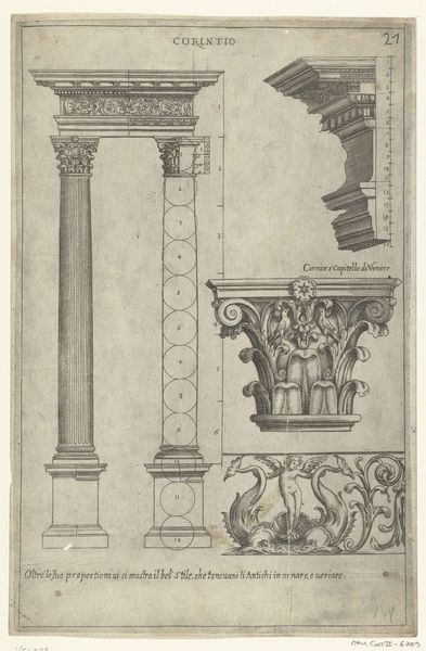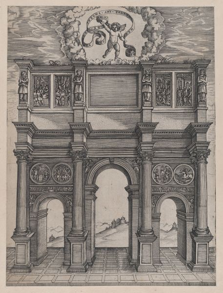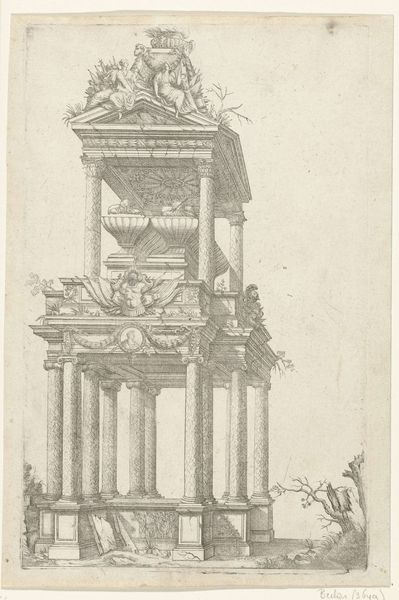 Agostino Veneziano etched this print of the Temple of Antoninus and Faustina, part of the "Speculum Romanae Magnificentiae," sometime in the early 16th century. Here, the ruins of the Temple with its Corinthian columns serve as potent symbols of classical antiquity. These columns, with their ornate capitals, evoke the grandeur of Roman architecture and its aspirations to permanence. Yet, nature reclaims the stone where plants sprout from the temple ruins, speaking to time's inevitable triumph over human constructions. Consider how the column motif has permeated Western art and architecture. From the pillars of ancient Greece to the Renaissance revival, the column symbolizes strength, stability, and a connection to the past. But here, the ruined state suggests a more complex narrative. These ruins invoke feelings of nostalgia, melancholia, and contemplation of mortality. The emotional power of the image lies in its ability to evoke a sense of loss and reflection on the transience of human achievement. The presence of these classical symbols underscores the cyclical nature of history.