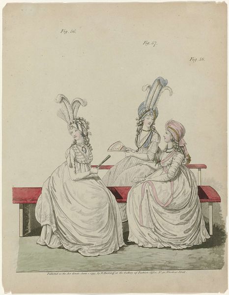 Editor: This is Thomas Rowlandson's "Longways Dance," currently residing in the Tate Collections. It's a delicate watercolor showing figures that seem almost caricatures. What story do you think Rowlandson is telling through these materials? Curator: Looking at Rowlandson's "Longways Dance", I'm drawn to the social context embedded in the materials. Watercolor, often seen as "lesser" than oil, signals a specific market. Consider the labor involved in producing those elaborate dresses—who made them, and under what conditions? Editor: That’s a great point, it certainly gives me a new perspective. Thanks! Curator: It's all about examining the means of production, isn't it? Fascinating, really.