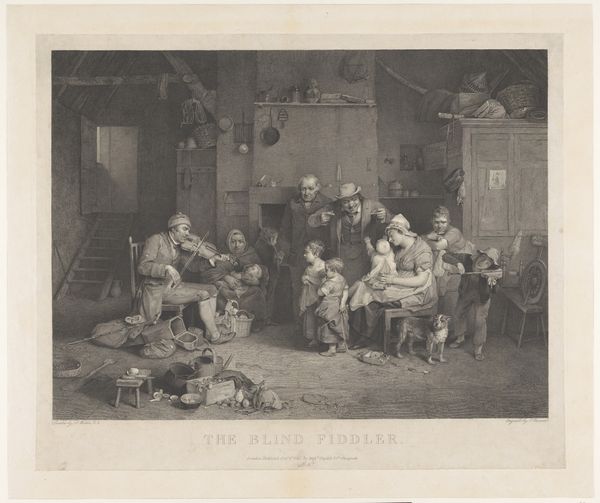 Curator: This is “Interieur met mannen in discussie rond een tafel,” created sometime between 1812 and 1814. The print is currently held in the collection of the Rijksmuseum. Editor: Oh, a gathering, perhaps tense? I immediately note the contrast – a confined space teeming with figures, yet rendered with such intricate line work. There's a clear compositional focus on the central table. Curator: Interesting that you bring up line work. The print medium itself is central to the image. This print, likely an engraving, reproduces another artist's work; Raimbach was known for creating affordable versions of popular paintings that allowed the public access to art previously confined to the wealthy. Editor: True, and yet that reproducibility, those multiplied lines, don’t diminish the emotional impact. Observe how light plays across the textures. Curator: Indeed. Consider the way these men are assembled, their body language conveying various emotional states; some engaged in debate, others quietly listening. I wonder about their respective roles and how that would’ve affected the exchange of ideas within that particular social milieu. Editor: Let’s examine those individual figures. Look at the boy reading—a signifier of changing literacy? Or consider the textures conveyed—wood, cloth, even the implied grime on their clothes—all achieved through the careful distribution of engraved lines. Curator: Absolutely. The artist certainly had an eye for detail and an interest in depicting contemporary life in all its complexity. But it’s interesting that while striving for realism, there’s an underlying Romantic sensibility. Notice the slight idealization. Editor: The composition itself guides us; the lines almost create their own world of shadows. It does highlight the material constraints and skillful labor needed for printmaking at this time. Thank you. Curator: An insightful and efficient deconstruction. I agree it offers some telling insights into its art historical context.