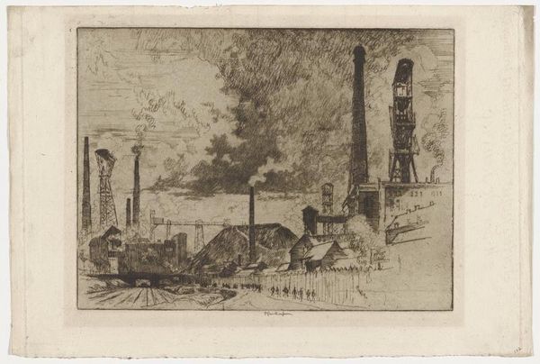Joseph Pennell made this print, "The Colliery," using etching. It captures the overwhelming symbolism of the industrial age. The dominant visual element is the towering smokestack, reminiscent of obelisks in ancient Egypt, symbols of power and permanence. Here, however, the plume of smoke suggests not triumph, but a suffocating atmosphere. Consider how these forms have morphed through time - from ziggurats, minarets, pyramids, and now these stacks. They pierce the sky, but what message do they carry? The endless march of workers below evokes images of mass migrations in ancient times, or even the somber processions of mourners. The psychological weight of this image lies in the juxtaposition of human activity with these ominous forms. We are left to ponder: is this progress or a descent into a new kind of darkness? The cycle continues, with humanity's creations echoing primal fears and aspirations.