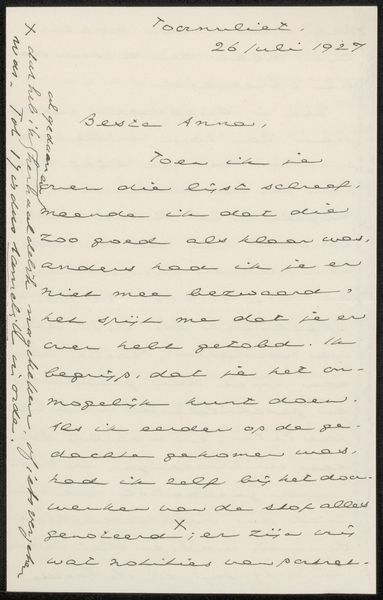 This letter to Philip Zilcken, probably written in the early 1920s, is an intimate encounter with Verstijnen's mind, a window into his immediate thoughts and feelings. The violet ink, applied with a fluid hand, dances across the page. Look closely and you'll see the pressure of the nib varies, creating thick downstrokes and delicate hairlines. This reminds me that writing, like painting, is a physical act. The writer's body, the tool in their hand, the surface they work on—all these elements come together to create something unique. The words cluster together, a dense thicket of thought, mirroring the way thoughts crowd our minds, each vying for attention. Notice the generous loops and flourishes, the way the lines occasionally veer off course, as if the writer's thoughts are running away with them. This piece is not just a message; it's a record of a mind in motion. It reminds me of Cy Twombly's scrawled paintings, where the act of writing becomes a form of abstract expression. Art is an ongoing conversation, a messy, beautiful, and imperfect exchange of ideas across time.