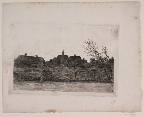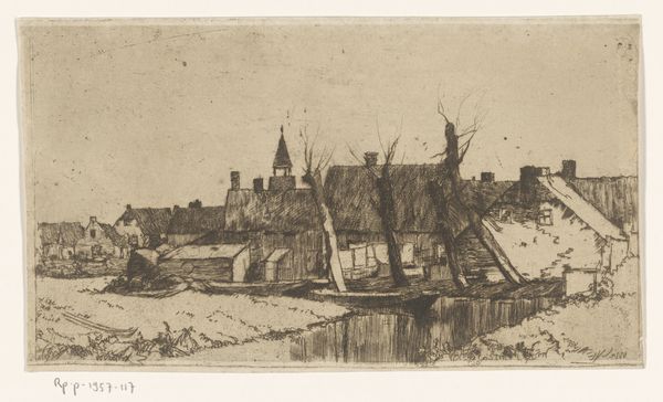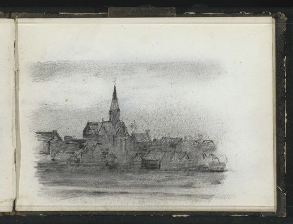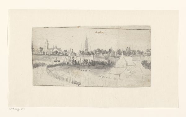 Editor: This is "Gezicht op Burick, 1672" attributed to the frères Moreau, a pencil drawing made sometime between 1900 and 1903. It feels so fragile, like a half-remembered dream. It is like a memory fading into the paper. What's your impression of it? Curator: Ah, yes, quite dreamlike! I’m struck by the vast emptiness that surrounds this compact cityscape. It gives me the impression of looking not just at a place, but at time itself, with all of history bearing down. I also think that pencil as the medium does play into that feel; does the artist feel close or far away from this image? Editor: That’s interesting! It does feel distant. And I like how you pick up on how the openness accentuates the heaviness, that compression, of the city. There is so much detail packed in such a slim format. How does this drawing speak to that era? Curator: Good question! These pencil lines mimic architectural engravings, offering detailed yet personal impressions of buildings with remarkable simplicity and precision. Maybe there is also some sort of reflection by the artist; drawing and memory itself could be an act of precise simplification. Maybe this pencil-drawing process becomes something deeply spiritual in this landscape! What do you think? Editor: I love that idea, of drawing being a spiritual act. Seeing it that way opens up so much about the artist's connection to the landscape. Thanks, this was wonderfully insightful. Curator: It was a pleasure looking with you! These glimpses of our own reflections can indeed change everything!
