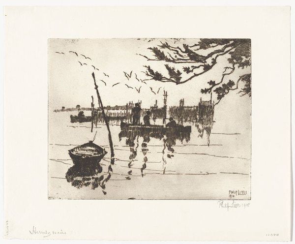 Philip Little made "Seiners", this small etching, sometime in the late 19th or early 20th century. Look at how the hatching marks build up density and tone; it's almost architectural in its construction. The whole scene feels carefully crafted, not just represented. The materiality of the print is key here. The ink sits slightly raised on the paper, giving a tactile quality to the scene. The reflections in the water are particularly captivating. See how the vertical marks dissolve into horizontal smudges, blurring the line between the real and the reflected. It’s like Little is showing us how vision itself is a process of interpretation, of making sense of blurry inputs. The mark-making reminds me of Whistler's etchings, with that same sense of moody atmosphere. But Little's got his own thing going on. He is interested in process, and reminds me a little of my own drawing practice. Anyway, its nice to see artists from different eras speaking to each other through their work.