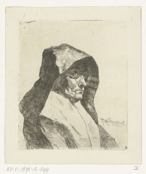 Editor: This is Muirhead Bone's portrait of Joseph Conrad, made between 1923 and 1925. It looks like it's a pencil drawing or a print of one. I’m struck by how much empty space there is, making the figure seem a bit isolated. What stands out to you? Curator: That isolation you perceive is quite interesting when considering Conrad's own biography as well as his literary themes. Here we have a depiction of a very influential author in British literature, who in reality was Polish, writing in his third language, constantly navigating shifting social and political landscapes. Does knowing that potentially shift how we perceive this image within a cultural framework? Editor: Definitely! I hadn't considered the complexities of his background. Knowing he was essentially an outsider by choice and circumstance impacts my view. The reserved depiction now feels deliberate, hinting at a conscious decision to observe rather than fully integrate. But Bone was Scottish. Was this common, artists portraying individuals from different cultural backgrounds? Curator: Precisely! That is a keen insight! Bone was deeply embedded within artistic and literary circles. These networks facilitated exchanges and influenced the public’s perception and artistic output. These portrayals reflect the intertwined nature of cultural and social elites. These elites impacted what stories and images reached a broad public audience through publication and exhibitions. Editor: So the portrait itself is almost a statement about cultural acceptance, or at least, cultural visibility, during that period? A form of legitimation, perhaps? Curator: Precisely! The circulation of such imagery performs powerful functions in society. Understanding such visual politics in images adds richness and encourages greater analysis. What did you learn by viewing this work? Editor: Considering Bone's 'Joseph Conrad' within the wider cultural context definitely adds another layer of understanding that goes beyond just appreciating it as a drawing! Curator: Indeed! Appreciating how power dynamics shape seemingly simple images like portraits unveils deeper meanings.