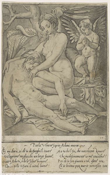 Editor: So, this is "Hercules and Nessus," an engraving by Marcantonio Raimondi, dating from around 1504 to 1509. The energy is intense, you can really feel Hercules' anger, right? I mean, what is your interpretation of this piece? Curator: Well, seen through a historical lens, engravings like this one played a crucial role in disseminating classical stories and artistic styles across Europe. The figure of Hercules, particularly, carried immense political weight. Think about the patrons and collectors who would have seen this. Who were they trying to emulate? Editor: Kings? Emperors? I see Hercules about to strike Nessus here. He’s avenging Deianira… Did they view themselves as these heroic figures bringing order, crushing their rivals? Curator: Precisely. The image normalizes power, and superior male dominance, which is visually aligned with how the patriarchy operated and projected power in those days. Notice also the artist's use of line to create the muscularity and drama, really emphasizing the hero’s idealized body, which also carried social messages. How do you see it functioning within, say, the court of Francis I, who was known to commission and collect similar works? Editor: I guess in that context, it serves almost as propaganda. A reminder of the King's strength and authority and righteousness. Curator: Exactly. The print’s dissemination becomes a political act. It shaped how people understood power and justified social hierarchies, especially with easy access given the print form. It makes me wonder about the modern echoes of these representations today... What have you gleaned from it all? Editor: How the art is viewed differs in meaning depending on context, such as now seeing engravings as early forms of accessible reproductions of a very political era! Thanks. Curator: A critical interpretation that re-contextualizes classical representation of heroic figure. Very insightful, well done.