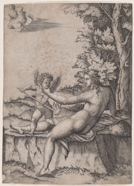 Editor: So, this is "Hercules and Nessus," an engraving by Marcantonio Raimondi, dating from around 1504 to 1509. The energy is intense, you can really feel Hercules' anger, right? I mean, what is your interpretation of this piece? Curator: Well, seen through a historical lens, engravings like this one played a crucial role in disseminating classical stories and artistic styles across Europe. The figure of Hercules, particularly, carried immense political weight. Think about the patrons and collectors who would have seen this. Who were they trying to emulate? Editor: Kings? Emperors? I see Hercules about to strike Nessus here. He’s avenging Deianira… Did they view themselves as these heroic figures bringing order, crushing their rivals? Curator: Precisely. The image normalizes power, and superior male dominance, which is visually aligned with how the patriarchy operated and projected power in those days. Notice also the artist's use of line to create the muscularity and drama, really emphasizing the hero’s idealized body, which also carried social messages. How do you see it functioning within, say, the court of Francis I, who was known to commission and collect similar works? Editor: I guess in that context, it serves almost as propaganda. A reminder of the King's strength and authority and righteousness. Curator: Exactly. The print’s dissemination becomes a political act. It shaped how people understood power and justified social hierarchies, especially with easy access given the print form. It makes me wonder about the modern echoes of these representations today... What have you gleaned from it all? Editor: How the art is viewed differs in meaning depending on context, such as now seeing engravings as early forms of accessible reproductions of a very political era! Thanks. Curator: A critical interpretation that re-contextualizes classical representation of heroic figure. Very insightful, well done.