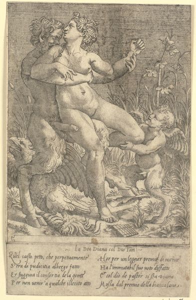 Editor: So, this is "Hercules and Nessus," an engraving by Marcantonio Raimondi, dating from around 1504 to 1509. The energy is intense, you can really feel Hercules' anger, right? I mean, what is your interpretation of this piece? Curator: Well, seen through a historical lens, engravings like this one played a crucial role in disseminating classical stories and artistic styles across Europe. The figure of Hercules, particularly, carried immense political weight. Think about the patrons and collectors who would have seen this. Who were they trying to emulate? Editor: Kings? Emperors? I see Hercules about to strike Nessus here. He’s avenging Deianira… Did they view themselves as these heroic figures bringing order, crushing their rivals? Curator: Precisely. The image normalizes power, and superior male dominance, which is visually aligned with how the patriarchy operated and projected power in those days. Notice also the artist's use of line to create the muscularity and drama, really emphasizing the hero’s idealized body, which also carried social messages. How do you see it functioning within, say, the court of Francis I, who was known to commission and collect similar works? Editor: I guess in that context, it serves almost as propaganda. A reminder of the King's strength and authority and righteousness. Curator: Exactly. The print’s dissemination becomes a political act. It shaped how people understood power and justified social hierarchies, especially with easy access given the print form. It makes me wonder about the modern echoes of these representations today... What have you gleaned from it all? Editor: How the art is viewed differs in meaning depending on context, such as now seeing engravings as early forms of accessible reproductions of a very political era! Thanks. Curator: A critical interpretation that re-contextualizes classical representation of heroic figure. Very insightful, well done.