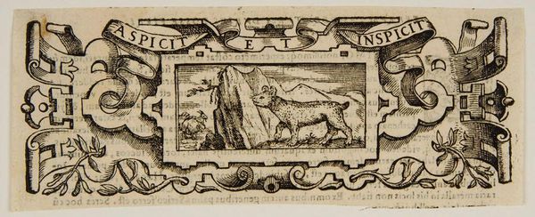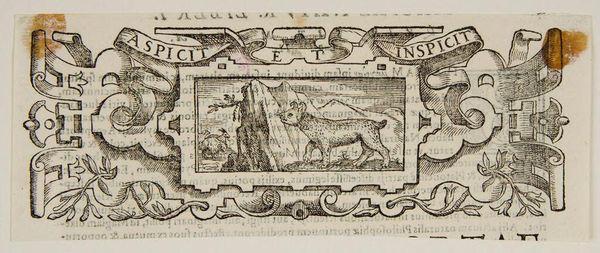 Curator: This intriguing piece is known as "Head-piece", its maker remains anonymous. There's a definite old-world feel to this small print. Editor: It strikes me as rather allegorical. The dog appears to be inspecting something; it's surrounded by mountainous terrain. There's a sense of vigilance here. Curator: The Latin phrases "ASPICIT" and "INSPICIT" on the banners suggest exactly that—looking at and examining. Animals in art often function as symbols for human traits, reflecting contemporary socio-political dynamics. Editor: So, the animal's focused gaze might comment on contemporary power structures, perhaps critiquing surveillance or advocating for sharper observation. Curator: Precisely. The piece invites us to question who observes and who is observed. It may act as commentary on the powerful. Editor: Considering the context, it urges viewers to critically assess the world around them. Curator: It's interesting how art can be a tool for analyzing our society. Editor: Indeed. Art like this helps us understand the world, then and now.
