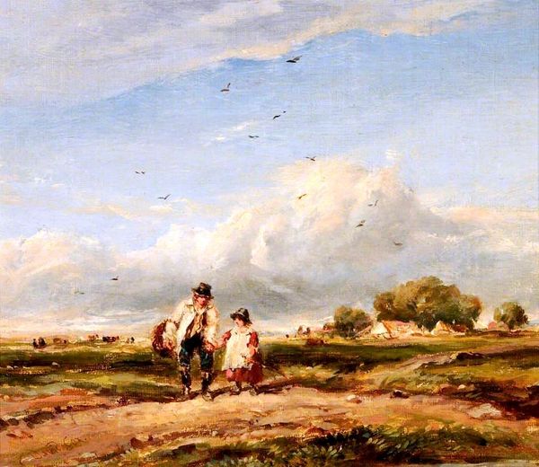 Curator: Carl Spitzweg’s “Sunday Stroll,” painted in 1841, offers us a glimpse into a romantic vision of German life. The work, executed in oil paint, presents a family walking through a field of golden wheat. Editor: My immediate sense is one of gentle quaintness. It’s a little dreamlike, the figures almost floating within the golden landscape, their elaborate clothes hinting at aspirations just slightly out of reach given the humbleness of their stroll. Curator: Indeed, the figures and their clothing draw focus. It is crucial to note the attention to material— the fabrics, the way the light interacts with the dyes, hinting at their construction, and the social stratification suggested by these elements. Editor: Exactly. The fact that the family is in the field is interesting to consider. The stroll on what appears to be their day of leisure can be seen as the construction of gendered roles of the women and the power roles displayed in their dress and tools to tame the wild of nature represented by the golden wheat. The male figure in the image is placed towards the front, in the golden field with no sun umbrella nor any burden to carry besides his lifted hat. Curator: Precisely, and considering Spitzweg’s own middle-class background as a pharmacist, one can speculate as to how the production of pigments and medications in his practice could intersect and influence his approach to painting and constructing his subjects' roles and identity, a way to visually display social status. Editor: The work can be interpreted on various levels. What resonates most profoundly, at least for me, is the image of domesticity that Spitzweg crafted—but not without an edge of irony. Are they merely observing nature, or is this stroll about maintaining and reinforcing cultural norms? Curator: The painting technique further emphasizes this vision, doesn't it? The soft brushstrokes, the light diffused across the canvas – they contribute to an ideal that conceals as much as it reveals about the process of representing people’s place within their economic and cultural milieu. Editor: Agreed, considering the piece through today’s theoretical frameworks allows one to interrogate assumptions, not merely about that particular moment but of similar portrayals of “leisure” that serve other purposes than appearing picturesque. Curator: Precisely, I appreciate having shed some light on this canvas by delving into how the work's components come together, literally and figuratively, to reinforce our reading of the cultural values held when produced and its contemporary resonance today. Editor: It allows us to question not only their place in that era but also how society depicts identity constructs like power, gender, and privilege. Thank you!