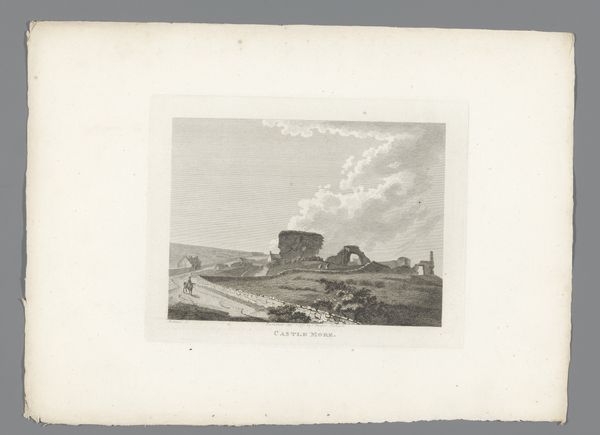 Editor: Here we have an engraving, possibly from between 1791 and 1795, titled "Gezicht op de ruïnes van Grandison Castle," or "View of the Ruins of Grandison Castle." It’s by an anonymous artist, and it's housed right here at the Rijksmuseum. It's really striking how delicate and detailed the engraving is, almost like a photograph. What captures your attention most about this piece? Curator: Ah, ruins! They whisper tales, don't they? For me, it's the contrast between the obvious decay and the sheer steadfastness. Look how the artist renders the stone, so precisely, yet we know time is the ultimate sculptor. There’s a gentle melancholy hanging in the air, wouldn’t you agree? It’s not just a depiction of a place, it’s a meditation on time, power, and perhaps, loss. I wonder, do you feel a connection to the Romantic movement here? Editor: Definitely, that melancholic feel is very Romantic! I can sense that contemplation on time and loss you mentioned. How do you think the landscape itself contributes to that mood? Curator: Clever question! See how the mountains fade into the background? They feel almost indifferent to the ruins, eternal witnesses to human endeavor. And that sky, full of soft, transient clouds… it’s a constant reminder of change, compared to the static, crumbling castle. The artist isn't just showing us a pretty picture; they're inviting us to contemplate our place within a vast, indifferent universe. Makes you feel rather small, doesn't it? Editor: Absolutely. I never thought about the landscape being indifferent before. It gives the ruins so much more context! I'll never look at a landscape the same way again. Curator: Excellent. Keep those eyes – and your mind – open! Art has a funny way of rewriting your senses.