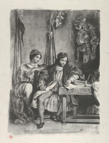 Curator: Eugène Delacroix’s diminutive print, “Goetz de Berlichingen Writing His Memoirs”, depicts the famous knight penning his life story, perhaps with his secretary at his side. Editor: The somber blacks and grays create a feeling of confinement, don't they? The subjects seem closed off, despite the intimacy of the scene. Curator: Absolutely. Delacroix was deeply interested in the Romantic literary movement; Berlichingen was a rebel figure, and his memoirs challenged social norms. Editor: Note how the composition directs our gaze inward: the knight’s hand is centered, the light focuses on the book. The armor in the background creates an odd juxtaposition of domesticity and martial life. Curator: Indeed. The inclusion of armor hints at his past exploits, emphasizing the social and political tensions inherent in recounting his life. Editor: It all adds to the dramatic intensity. What a study in tonal control. Curator: Delacroix uses the setting to subtly probe the role of individual expression against the backdrop of historical narrative. Editor: A pensive reflection, rendered with great visual nuance. Curator: And a wonderful example of how art can illuminate a life, real or imagined.