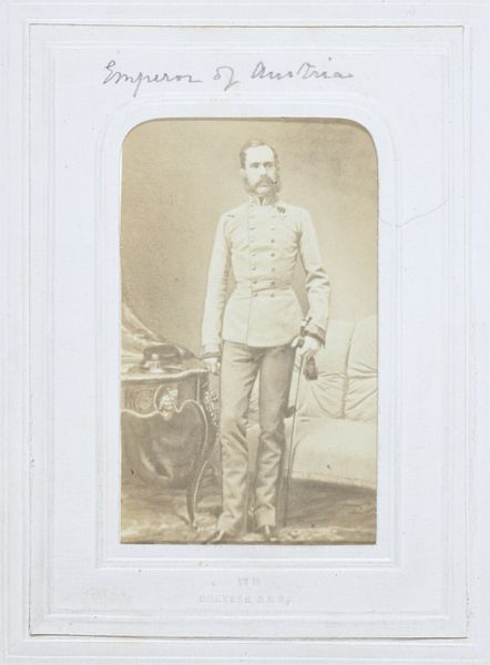 Curator: This is a photographic portrait of Emperor Franz Joseph I of Austria, made sometime between 1870 and 1885. It appears to be a daguerreotype, a very early type of photographic image on silvered copper plate. Editor: It’s striking how small and almost faded it seems. He looks so stiff and formal. Everything is precise—the neatly trimmed beard, the pristine white uniform. There's something a little melancholic about the whole thing, even if he appears regal and composed. Curator: The daguerreotype process does tend to give images a certain ethereal quality, capturing minute detail and delicate tones. Look at the precise depiction of his uniform and the details on his medals and facial hair. The rigidity, though, that's characteristic of the formal portraiture of the time—carefully staged to project authority and strength. Editor: And that very carefully chosen, high-buttoned white uniform evokes military power, doesn’t it? White uniforms often symbolize purity, but here, in the context of the Austro-Hungarian Empire, it reinforces notions of hierarchy and perhaps even untouchability. Franz Joseph's reign was a long and turbulent one, filled with nationalist movements and social change… the image glosses over all the unrest and repression. Curator: Yes, visual culture functioned differently then. Photography was gaining traction, yet paintings continued to reign. These portraits functioned more like standardized symbols than as candid personal insights. Think about the enduring symbols attached to his visage. The trimmed facial hair, which would change through the decades of his rule, were so distinct to Franz Joseph I, yet even now are immediately recognizable and recall particular moments and crises throughout his monarchy. Editor: I see the point about historical symbolism— but, seeing it as an object, too, gives the piece more depth. Think about who created it. We don’t know who the photographer was. They become obscured because it serves the single imperial narrative—that’s just such a contrast to how we create and consume photography now. Curator: True. It reminds us that portraits like this were tools, actively shaping and cementing perceptions. The artistry resides as much in the composition as it does in the process. I now feel a newfound curiosity around the identity of the individual photographer. Editor: For me, I now think about the stories erased by the perfect white uniform and rigid posture, and all the marginalized individuals of the empire.