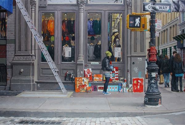 Editor: Here we have Vincent Giarrano’s “Red Facade”, a painting portraying an urban scene. I'm struck by how the bright red clashes with the gritty graffiti, almost as if highlighting the tensions between the individual and the environment. What do you see in this piece? Curator: This work speaks volumes about urban life and the layers of meaning embedded within our surroundings. Notice how Giarrano juxtaposes the individual – the woman entering the doorway – with the overwhelming visual noise of the city. How do you think the red facade itself contributes to the narrative? Editor: It’s so visually dominant, almost aggressive. Maybe it’s meant to represent the in-your-face nature of advertising or urban decay? Curator: Precisely! Think about the history of red-light districts or even revolutionary symbols associated with the color red. The graffiti also points to a dialogue between authorized and unauthorized expressions within urban spaces, who gets to speak, and where. What’s your sense of how gender might play into this? Editor: Interesting. The woman, seemingly anonymous, stands in contrast to the loud environment, and somehow, she seems both a part of it and apart from it. Is the gaze directed at her, or at the space she occupies? Curator: It's a pertinent question to ask! I think Giarrano forces us to consider our own positionality as viewers, too. This interplay highlights how public spaces are gendered, negotiated, and ultimately controlled. Editor: I hadn't considered the layered meanings of the color and graffiti within the urban landscape and how it relates to this person entering this red door. I appreciate your interpretation! Curator: And I learned how a simple juxtaposition can hold so many societal critiques. A valuable lesson, indeed.
