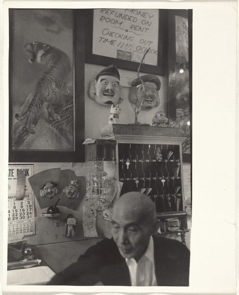 Robert Frank's gelatin silver print, "Street Scene - Lincoln, Nebraska," captures a stark, immediate moment. The composition is bisected by a vertical architectural element, dividing the frame between the foregrounded man and a display case. Frank uses the interplay of light and shadow to create a complex visual structure. Notice how the man's gaze drifts off frame, lending a sense of alienation. The juxtaposition of the man with the meteorological instruments suggests a broader commentary on observation and detachment. The man's relaxed posture contrasts with the precision instruments, creating a tension within the frame. Frank's choice to include these elements invites us to consider how we measure and understand our environment. This work reflects a post-structuralist approach to representation, challenging the idea of a fixed, singular meaning. It prompts us to see how photography can reveal underlying cultural codes and question established perceptions.