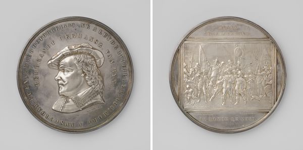 Editor: This intriguing metalwork is titled "Intrekking van het besluit om de Joden te verbannen uit Bohemen," or "Revocation of the Decree to Expel Jews from Bohemia," made in 1745 by Nicolaas van Swinderen. It’s so detailed! I’m immediately struck by the contrast between the two sides – one seemingly depicting a formal audience, the other what looks like… a building? What's your take on this work? Curator: Let's consider the materials themselves. The medal is crafted from metal, a durable and reproducible medium. This choice signifies a desire to disseminate a specific message broadly. The act of striking a medal, of creating multiples, implies a social intention beyond mere aesthetic pleasure. We need to ask, who commissioned this piece and what was their intention in producing it? Editor: I see what you mean. It wasn't made just for a private collection; it's almost like propaganda. Curator: Precisely. And what about the scenes depicted? The formal audience and the building on opposite sides… how do these visual representations contribute to our understanding of the act of revocation? Perhaps the building is intended to represent not the physical structure, but statecraft or bureaucracy in its essence. Editor: That’s interesting. I hadn't considered how the architectural rendering could symbolize larger political structures and institutions. Curator: Considering the circumstances of its production within the 18th century's complex social and political landscape is critical. These are potent clues as to who might have benefitted, and why create something in metal, to then be distributed for broad cultural gain. Editor: I suppose that studying the medium allows for a richer understanding of its use, creation, and the artist’s intended goal. I learned a lot just thinking about it. Curator: Agreed! Considering its materials allows the artwork's story to unfold in even more fascinating ways.
