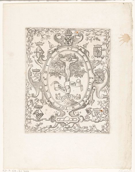 This is an anonymous, undated, ink on paper drawing of a frontispiece, which is a decorative design for the title page of a book. The drawing depicts a dedication to Don Joseph Alfonso, framed by symbols of power and prestige. At its center, a coat of arms is surrounded by a Latin inscription referencing Charles IV, King of Spain from 1788 to 1808. The drawing’s border, filled with delicate floral and vegetal motifs, softens the rigid formality expected of such a piece. This combination of heraldic imagery with organic, flowing designs invites us to consider the complexities of identity and status in the Spanish colonial world. It blends displays of authority with more intimate, personal touches. What does it mean to assert one's place within a hierarchy, while also seeking to cultivate a sense of individuality? This frontispiece offers a glimpse into how personal identity could be asserted within the structures of power.
