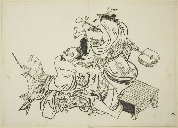 Okumura Masanobu created this print, "The Servant Choryo" in the 18th century, using woodblock printing techniques. Here, we see Choryo offering his sandal to Kosekiko, an act rooted in humility and respect. This simple object becomes a powerful symbol, echoing across cultures and histories. Consider the motif of the offering. It appears in ancient Roman rituals, where libations were poured to the gods, and in Christian iconography, with offerings of bread and wine during communion. The open hand, presenting something of value, is a primal gesture. It speaks of supplication, gratitude, and the desire for connection. The sandal, often seen as lowly, gains new meaning here. It is a token, charged with the weight of social dynamics. Kosekiko’s acceptance signifies a bond forged in deference, a silent agreement that transcends mere servitude. This echoes in our subconscious, reminding us of the delicate dance of power and submission. The act reverberates through time, evolving, adapting, and resurfacing in myriad forms, each imbued with the collective memory of human interaction.