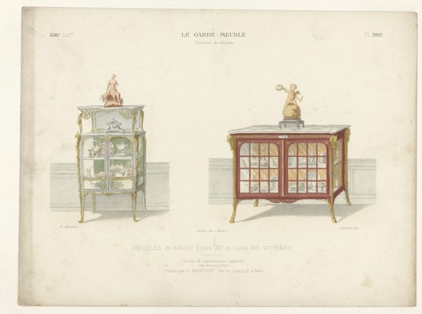 Editor: This drawing from the late 19th century, titled "Two Salon Tables in the Louis XVI and Louis XV Styles" by Léon Laroche, rendered in watercolor, feels almost like an architectural study. The way the light catches the gilded elements is so precise. What jumps out at you when you look at this work? Curator: The drawing excels in its demonstration of stylistic contrast through form. Observe the strict geometry of the Louis XVI table: its rectilinear structure is adorned with minimal, contained ornamentation. Editor: Right, it feels very restrained. Curator: Exactly. Now compare this to the Louis XV table. Note the cabriole legs, the serpentine curves of the tabletop, and the abundant, free-flowing ornamentation. Consider how line operates here. One seeks stability; the other, dynamic movement. Do you see how Laroche masterfully contrasts structure and surface embellishment? Editor: Yes, I see it. The lines on the Louis XV seem so much more fluid. Almost like they are trying to escape! It's interesting how the drawing highlights the core differences in design philosophy. I wouldn’t have appreciated that without looking closely at the lines. Curator: And how the application of watercolour serves to emphasise those contrasting qualities through variations in tone and saturation.