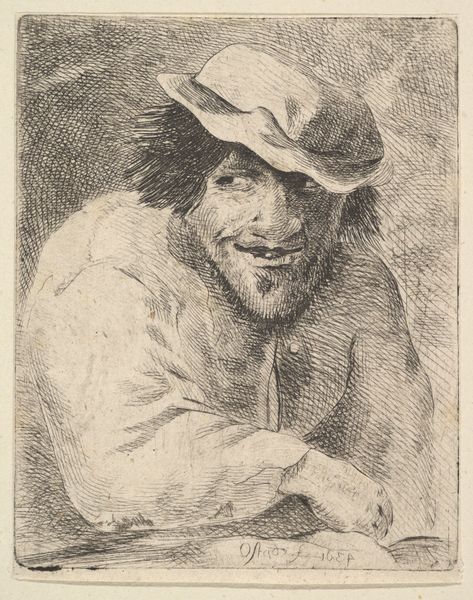 Editor: This print, by Francis Place, presents an intriguing, though unnamed, character. What cultural memories or associations does this image evoke for you? Curator: Notice how the figure’s exaggerated features and the almost grotesque smile play with established archetypes. Does he remind you of the trickster figure in folklore, the one who challenges social norms with a wink? Editor: I see that, definitely! Curator: The hat and clothing suggest a particular class or profession, perhaps a traveling merchant or a performer? The image invites us to consider the stereotypes and prejudices of the time. It’s a glimpse into a shared cultural understanding, wouldn’t you agree? Editor: I hadn't thought about it that way, but it makes sense. Thank you!