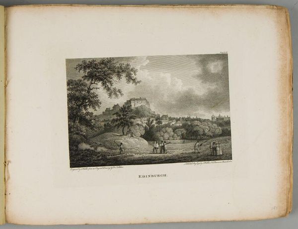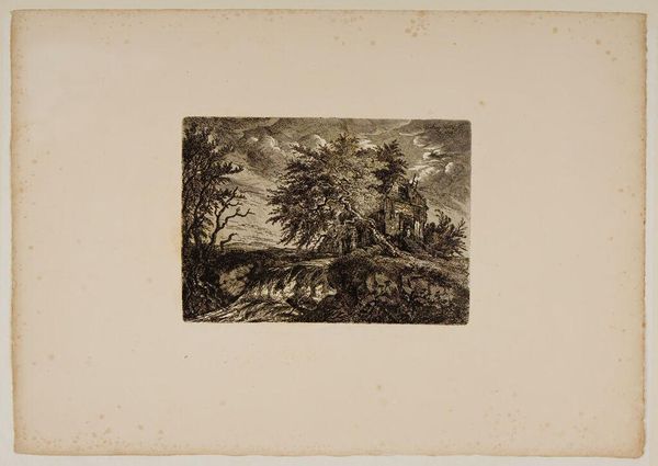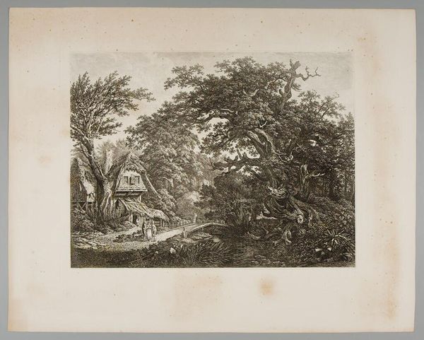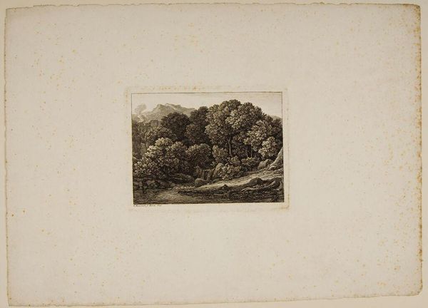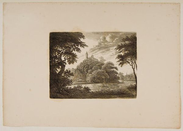 Curator: Here we have Johann Philipp Wilhelm Lenz's "Schloss Pouch," a landscape engraving that really captures a sense of place. Editor: It feels so insular. The composition seems to trap the building in a thicket of trees, reflecting a sense of isolation. Curator: It’s a fascinating way to frame power. The castle, typically a symbol of authority, appears almost swallowed by nature. Notice how the delicate etching work gives such weight to the trees. Editor: The artist presents us with a romanticized view of feudal power, obscuring the social dynamics and hierarchies at play during its time. Curator: Yet, there is an enduring quality to how Lenz portrays this architecture, one that resonates with the sublime blending of human construction and the natural world. Editor: For me, I leave with a feeling of unease about the unseen implications of class and power suggested in this image.