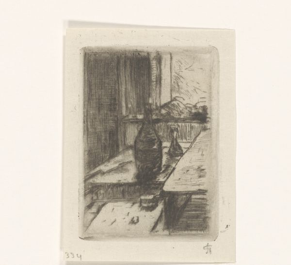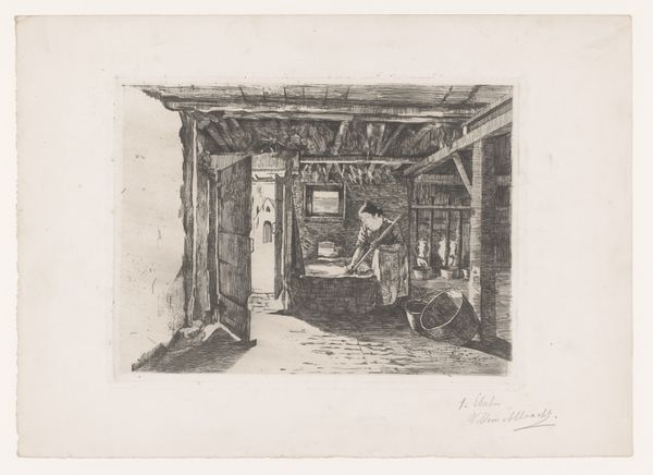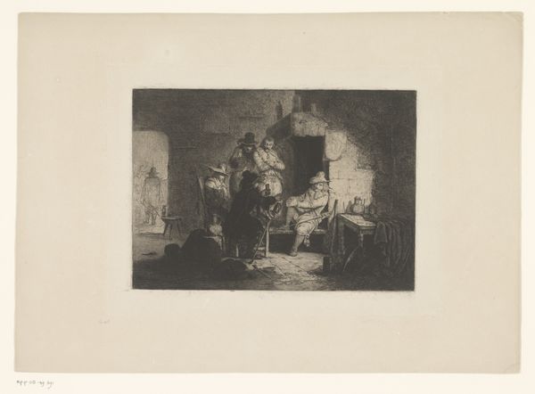 Cornelis Brouwer made this etching, "Kaarssnuitende man," which translates to "Candle Snuffer Man," using metal, acid, and ink. Etching involves coating a metal plate with a waxy substance, drawing through it to expose the metal, then dipping the plate in acid. The acid bites away at the exposed metal, creating lines that hold ink. The print shows a sparsely furnished interior with figures performing daily tasks under the dim glow of candlelight. It's a scene of modest labor, brought to life through the printmaking process. Consider the labor involved; from the artisan carefully manipulating tools and materials to the anonymous hands that produced the paper and ink. Brouwer employed techniques belonging to both craft and fine art, reflecting the cultural values of 18th-century printmaking. These images were relatively inexpensive, widely distributed and consumed across different social classes. By appreciating the materials, making, and social context of this etching, we understand its importance beyond aesthetics, challenging traditional distinctions between art and craft.