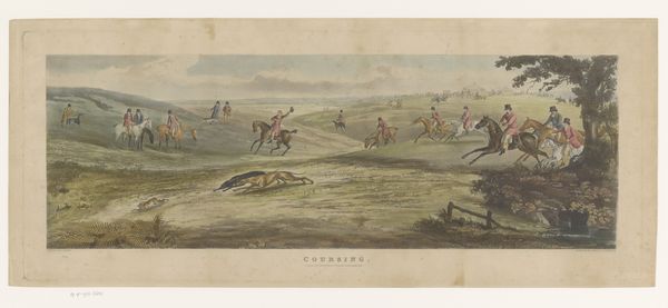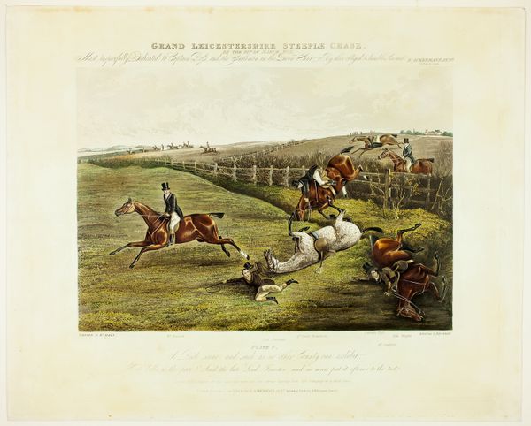 Charles Bentley's aquatint, "Dick Christian's Last Fall, from Grand Leicestershire Steeplechase," presents a dynamic, if unfortunate, moment in a horse race. Bentley's composition is structured by the diagonals of the horses' leaps and the landscape's rolling hills, which give a sense of vigorous motion across the scene. The earthy tones of the landscape and horses contrast with the crisp whites and blacks of the riders' attire and the dramatic fall of one horse. This work engages with the romantic-era fascination with nature and the sublime, framing the unpredictable and often perilous interaction between man and beast. The steeplechase, as a cultural event, reflects broader themes of risk, competition, and social status. Note the rider in mid-fall—his body upended, challenging fixed notions of control. The print's aesthetic structure mirrors the cultural moment, capturing both its excitement and its inherent instabilities. Bentley’s work invites us to consider how such images not only depict events but also participate in constructing cultural meanings and values.