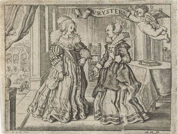 Curator: Let’s spend some time contemplating this print entitled, "Portret van Willem II, prins van Oranje, en Maria Henrietta Stuart," created in 1641. It now resides in the collection of the Rijksmuseum. Editor: Well, my first impression is this engraving feels surprisingly...staged. Like two porcelain dolls politely placed side by side on a shelf! It's an image carefully constructed to communicate power, but it reads as a tad...stilted to modern eyes. Curator: That impression is valid, considering the social function and the means by which the print was made. Engravings like this one weren't simply decorative; they served as vital political tools. Their creation and distribution reflect broader societal relationships: power, wealth, class. Editor: Ah, so it was like Instagram for the elite of the 17th century? Got to broadcast the alliance. A visual PR campaign almost! But look at Willem's expression. There is a definite coolness! It's the demeanor of someone well aware of his elevated status in society, wouldn't you say? Curator: I do, and his and Maria's elegant attires exemplify an economy of lavish excess; that massive, feathered hat, the ornate lace… These materials speak to Dutch and British trade relationships and consumer habits. Everything, from textiles to artistry, manifests labour. Even the composition – balanced, with attention given equally to both figures – communicates equity. Editor: I am taken by that odd cupid, or what seems to be one, perched over the town, perhaps promising their holy blessing and future heirs. Very bizarre and fairytale-like! What else might such elements reveal, outside of just status? Curator: Symbolism runs deep. That town and Cupid is an idyllic version of Dutch ascendency, and an image designed to instill patriotism in the masses and secure a continued legacy of class dominance. Editor: To bring this home, for a two-minute reflection, perhaps the beauty and the frustration for the contemporary viewer come from the collision of artistry and propagandistic needs. So different to the personal art forms we hold as standards now! Curator: Precisely. Consider the print as a historical artifact that not only pictures royalty, but captures the essence of political ideology as well.