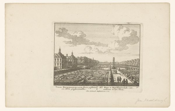 Jan van Call created this print, "Gezicht op Sorghvliet," offering us a glimpse into the formal gardens and grand estate of a prominent figure in the late 17th century. It reflects a period where wealth and social status were visibly displayed through meticulously designed landscapes. The print invites us to consider the relationship between power, space, and identity. The gardens, with their ordered patterns and classical architecture, symbolize control and dominion over nature and, by extension, society. What does it mean to cultivate an environment that reflects one's social standing? This manicured landscape can be seen as a stage where the elite acted out their roles. Consider the labor and resources required to maintain such an estate. The print hints at the complex social dynamics of the time, where the opulence of a few was supported by the labor of many. It prompts us to reflect on the structures of inequality that shaped the world Van Call depicted. It is a reminder of the social and economic disparities that have historically shaped our world.