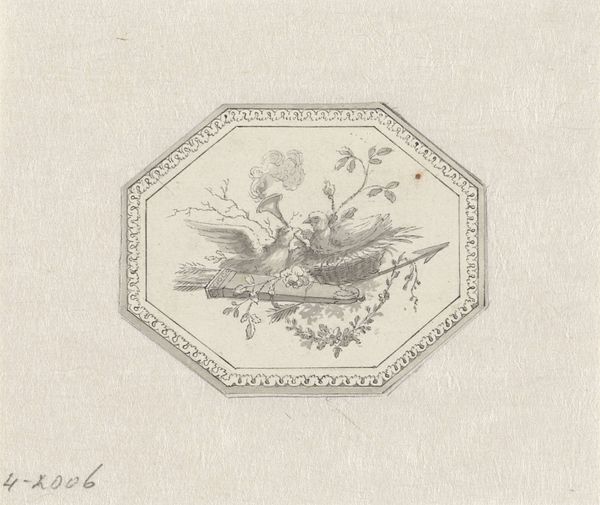 This is Wilhelm Steinhausen's "Final vignette," currently at the Städel Museum. The artwork captivates us with its symmetrical arrangement and delicate monochromatic palette, primarily composed of neutral tones that lend a classical and refined aesthetic. Look at the composition: Steinhausen employs a structured design featuring a central circular motif flanked by cherubic figures and hexagonal frames. Note the careful balance between geometric precision and organic fluidity, with floral and foliate elements interweaving around the rigid shapes. This juxtaposition creates visual harmony. The cherubs add a touch of classical allegory. The bees enclosed in hexagonal cells can be seen as a play between natural industriousness and human order, a theme often explored in the context of societal structures and utopian ideals. The symmetrical design reflects a formal approach, while the integration of naturalistic elements invites semiotic interpretations beyond pure aesthetics. The linear quality and balanced structure invite continuous re-evaluation of its aesthetic and cultural implications.