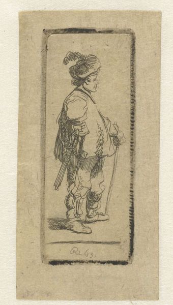 Curator: Looking at this drawing by Cornelis Bega, created sometime between 1650 and 1675, I am immediately struck by how grounded the figure seems. What's your first take? Editor: It’s got this air of quiet observation about it, doesn’t it? The man seems lost in his own thoughts, or maybe just… resigned. I’m getting melancholy vibes here. Curator: Melancholy perhaps, but also self-possessed, I think. The artist used a pencil to capture a sitter sporting a rather fetching hat, sporting also a magnificent mustache and holding a pipe—there’s a hint of swagger despite his relaxed pose. Editor: I see your point. The detail in the folds of his clothing is remarkable, particularly for a simple pencil drawing. There's an attentiveness there, a precision that elevates it beyond a mere sketch. The diagonal lines creating the background seem to imply the angle of repose in which this man sits. But who was he? Curator: That’s the delicious mystery, isn't it? Is this a character study, or a portrait? Bega was known for his genre scenes, everyday life, that sort of thing. I imagine him stumbling across this fellow in an inn and capturing the scene, the pose, so precisely. The work now lives at the Rijksmuseum. Editor: So, a slice of life from the Dutch Golden Age frozen in time. It's interesting how Bega uses light and shadow. See how he uses heavier lines to define the contours, then softer strokes for the shading, which creates depth and volume in an otherwise flat medium? It makes you wonder about the physical act of creating this image – his choices and the tools and how each relates to what’s conveyed, right? Curator: Absolutely. There's such a sense of immediacy here, and intimacy as well. To imagine him sitting there with the sitter—pencil scratching across the page... you can feel it, somehow. What a privilege to connect with the past in such a personal way. Editor: In short, Bega shows with remarkable efficiency the fleeting beauty and weight in simply, sitting, smoking and being. Nicely observed, artist, and us too, eh?
