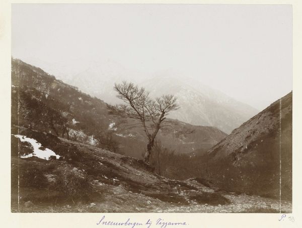Curator: This is a photograph titled "Meran Schloss, Tirol, looking towards the Ortler group" by the Bachrendt Bros. Editor: The tonal range here is so compressed—it creates this incredibly somber, almost ghostly, atmosphere. Curator: Note how the built structures—the castle, particularly—are situated upon these dramatic rock formations. It’s a potent compositional choice. Editor: Absolutely, but beyond just composition, the castle evokes familiar archetypes, the fairytale castle, fortified for protection. The high vantage point certainly lends that sense of power. Curator: And it's not just physical power, but a visual assertion of authority through its placement in the frame. That tower, the strongest vertical element, anchors the entire image. Editor: It also speaks to the relationship between humanity and the landscape. The castle as a symbol of our attempts to impose order on the natural world. Curator: Well articulated. The Bachrendt brothers leave us much to consider about that dynamic. Editor: Indeed, a picture pregnant with meaning and structural balance.